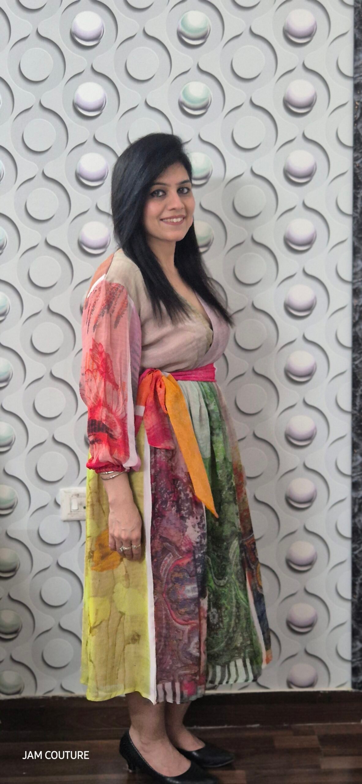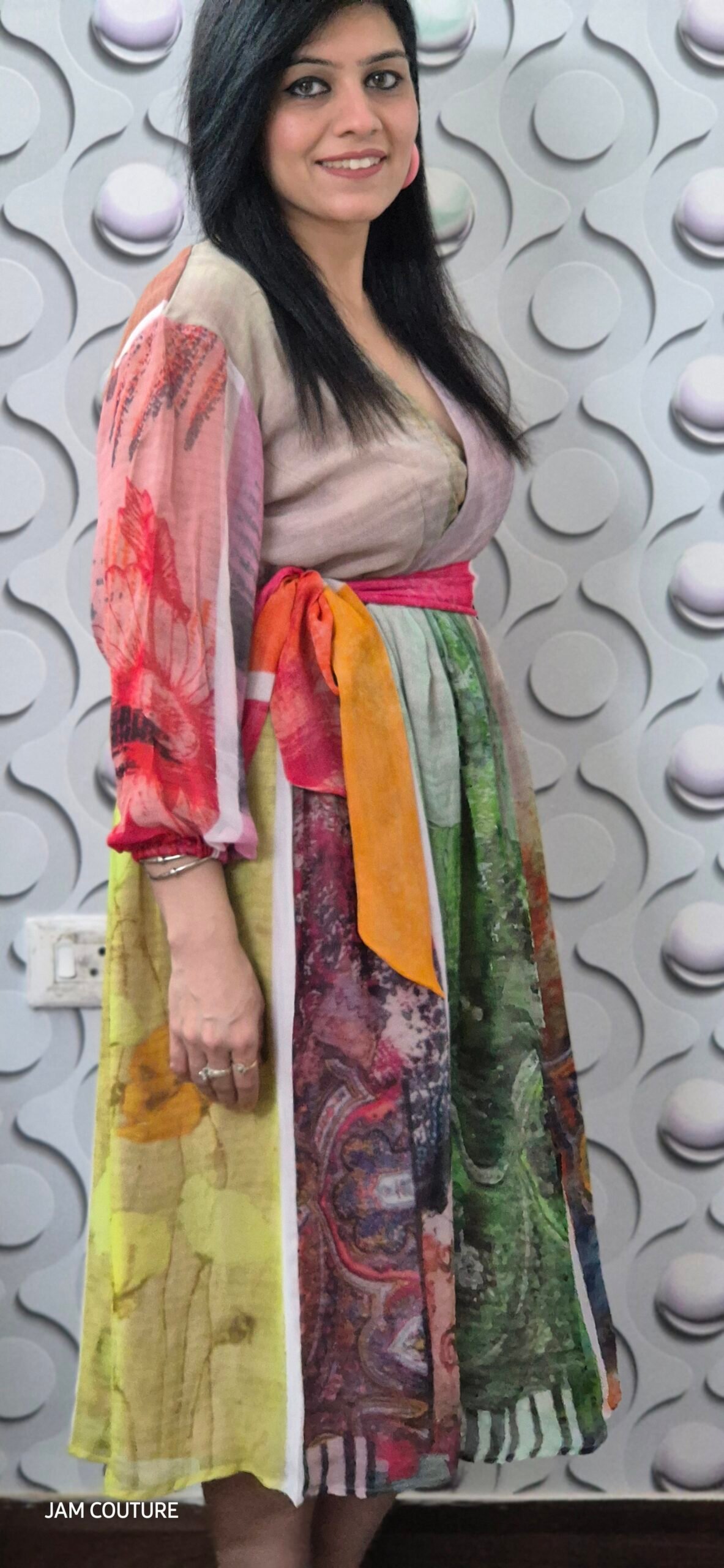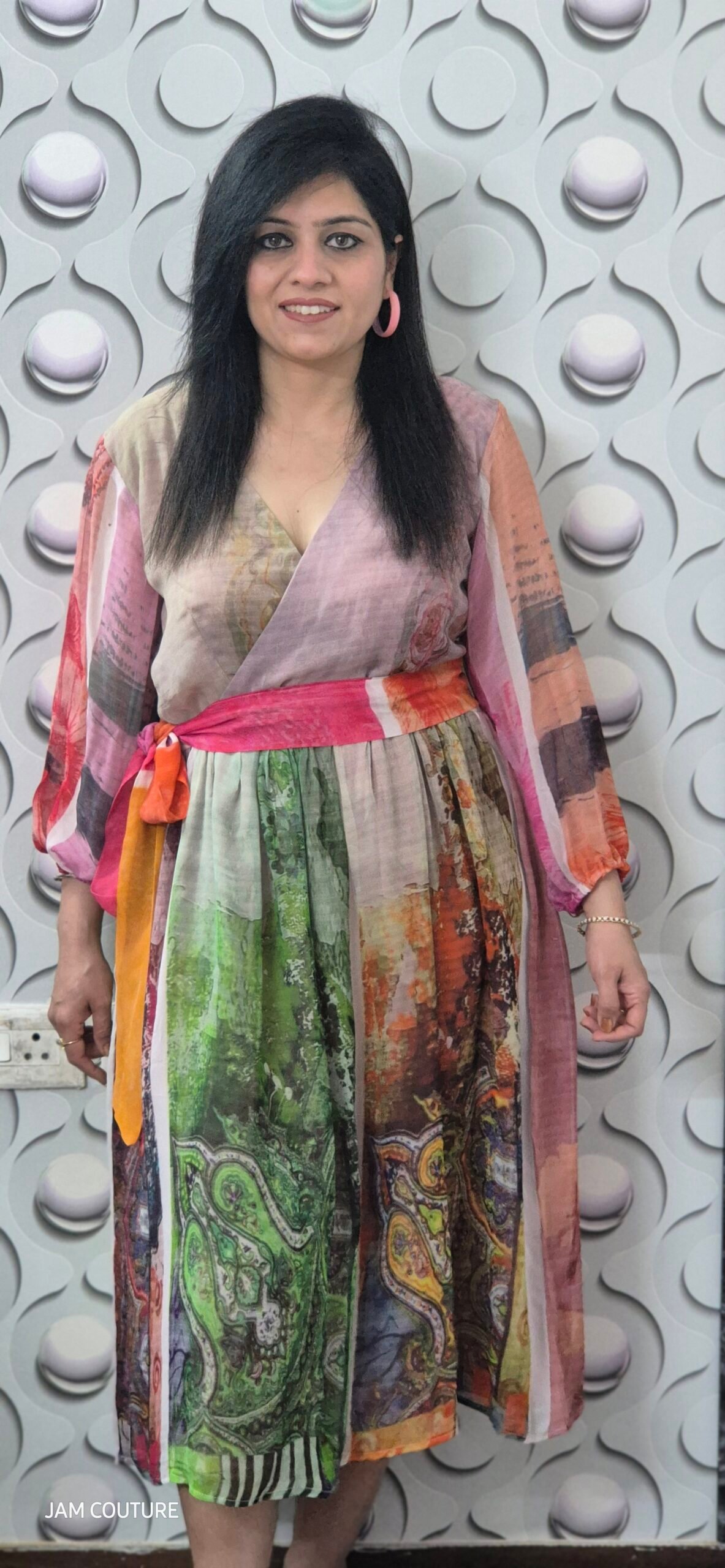 The abstract print design adds a modern artistic touch, while the overlapping Angrakha-style cut enhances the traditional yet contemporary appeal. Whether you’re attending a festive gathering, cocktail party, or cultural event, this dress ensures you look effortlessly stylish and elegant.