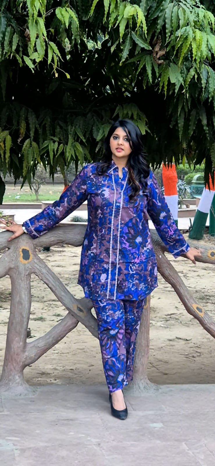 Make a statement with this stunning blue abstract print cord set, designed for the modern woman who loves effortless style with a touch of elegance. Crafted from premium, breathable fabric, this set features delicate lacework on the shirt, adding a graceful and feminine touch. The stylish pants offer a flattering fit, ensuring comfort and sophistication in every step. Perfect for brunches, vacations, or casual chic outings, this ensemble blends artistic flair with timeless fashion.