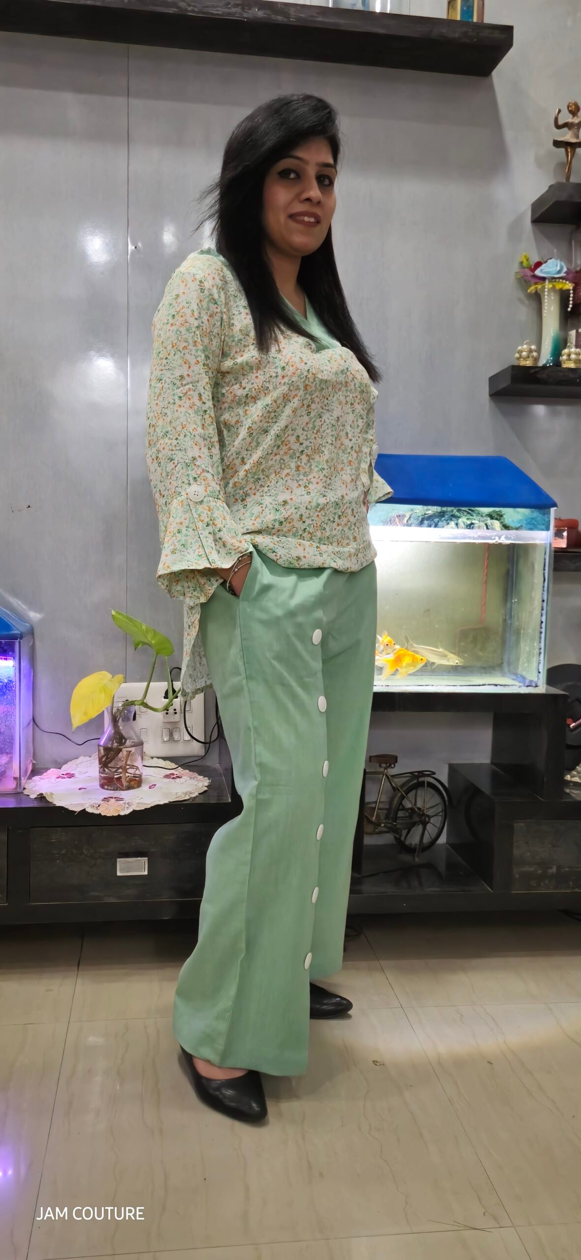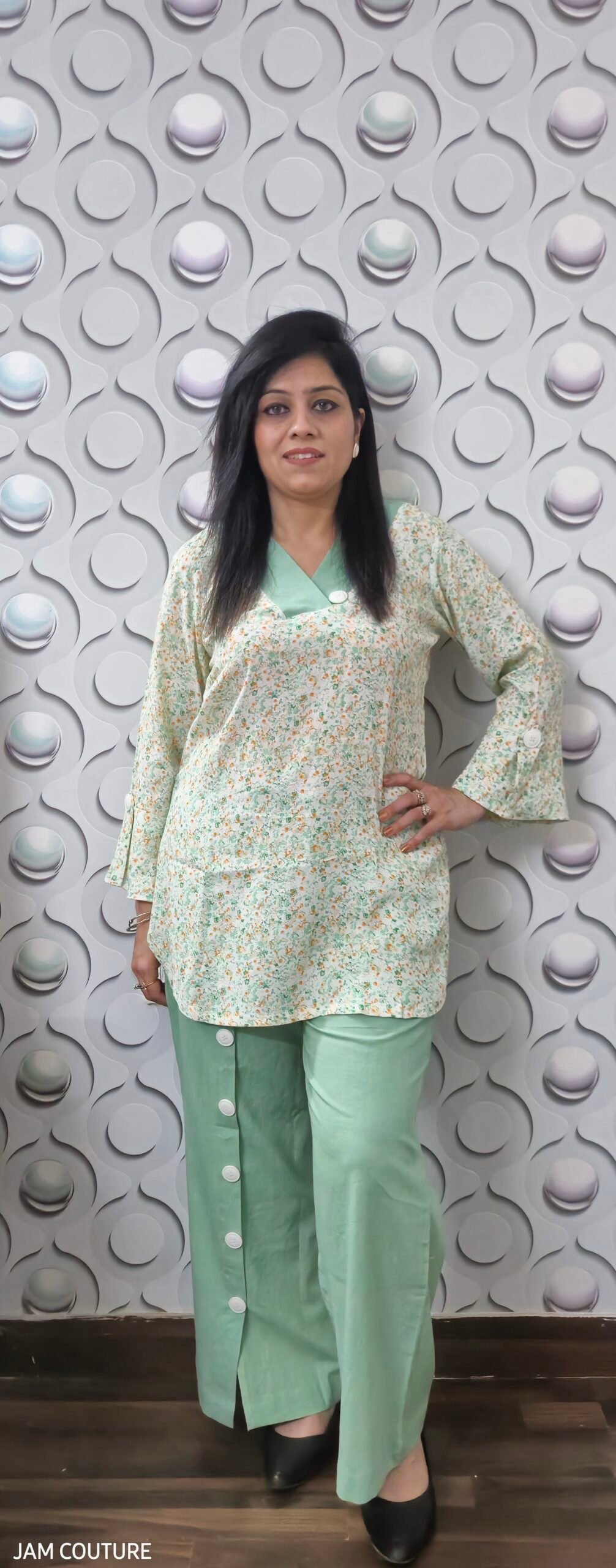 A standout feature of this set is the big button detailing on one panel of the pants, adding a trendy and chic touch. Whether you’re heading for a brunch, a casual outing, or a stylish workday, this ensemble keeps you looking effortlessly sophisticated.