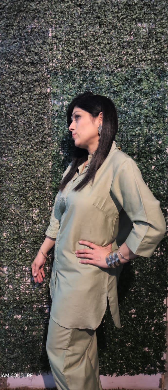 Step into effortless sophistication with this exquisite pistachio green cord set, a perfect blend of tradition and modern style. The shirt features a unique half-and-half design, with delicate chikan-kari embroidery on one side and premium cotton on the other, offering both elegance and comfort. The breathable fabric ensures a soft, lightweight feel, making it ideal for all-day wear. Paired with matching pants for a sleek and flattering silhouette, this set is perfect for brunches, festive gatherings, or casual outings.