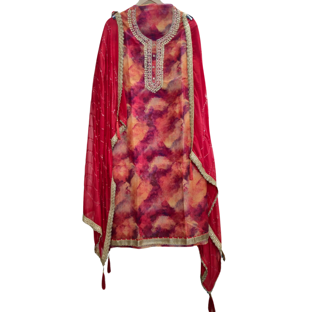 Make a statement with this soft organza unstitched suit, designed for those who love a blend of tradition and modern sophistication. Crafted in a stunning red abstract color, this suit features exquisite Kundan, pearl, and knot work on the neckline, adding a regal and intricate touch of elegance.