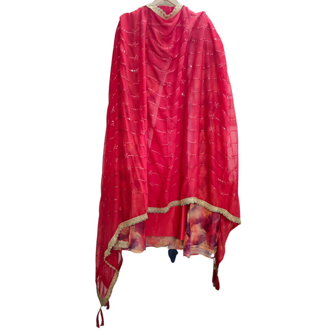 Complementing the suit is a lightweight chiffon dupatta, adorned with delicate lacework, shimmering sequin detailing, and playful tassels, ensuring a look that’s both graceful and striking. The unstitched design allows for a customizable fit, letting you tailor it perfectly to your style.