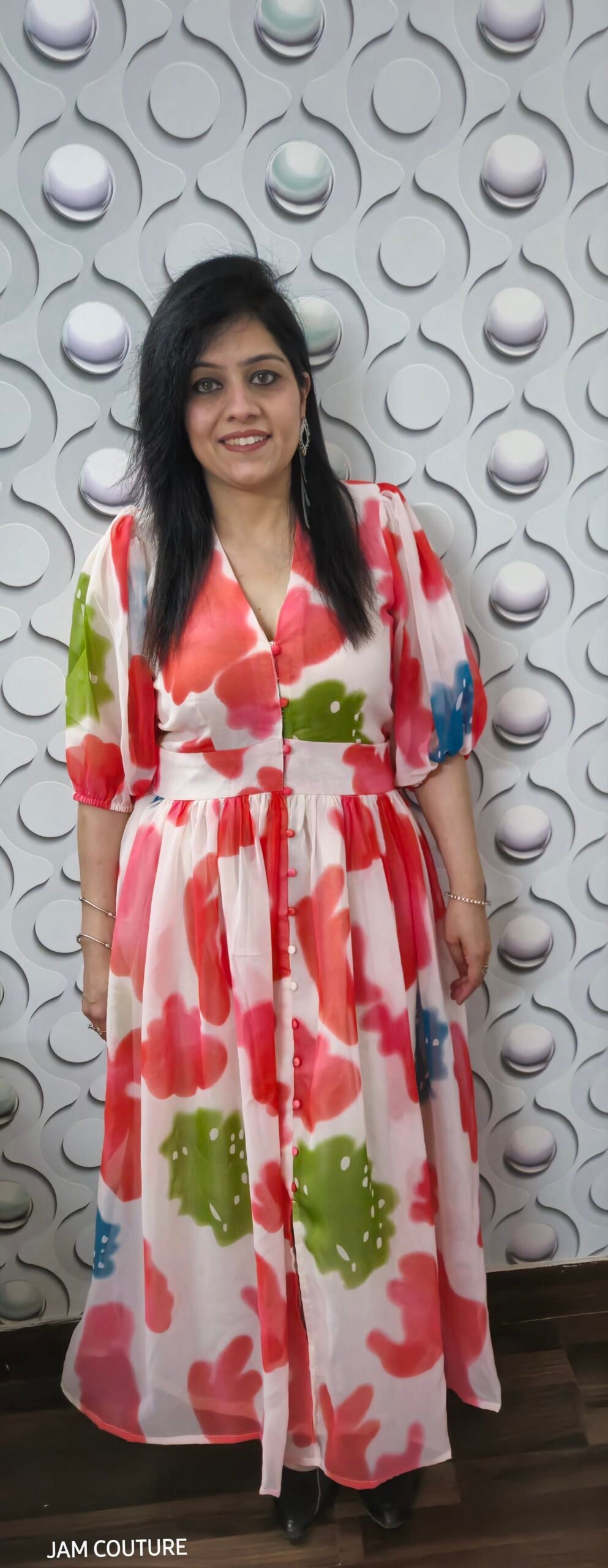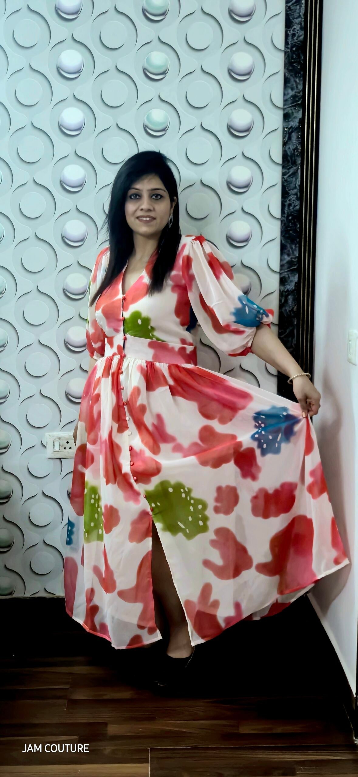 Make a bold yet elegant statement with this Chiffon Cocktail Dress, featuring a stunning red and blue abstract print on a soft off-white base. Crafted from lightweight and flowy chiffon fabric, this dress offers an ethereal drape, ensuring both style and comfort for any special occasion.