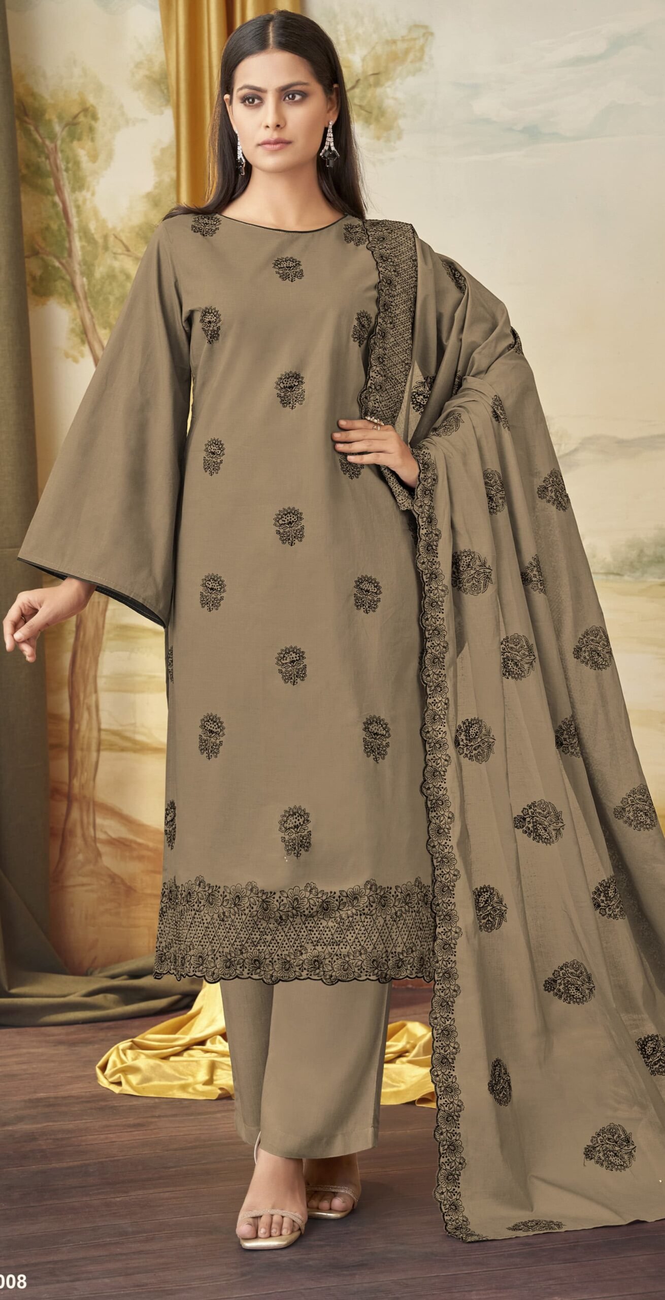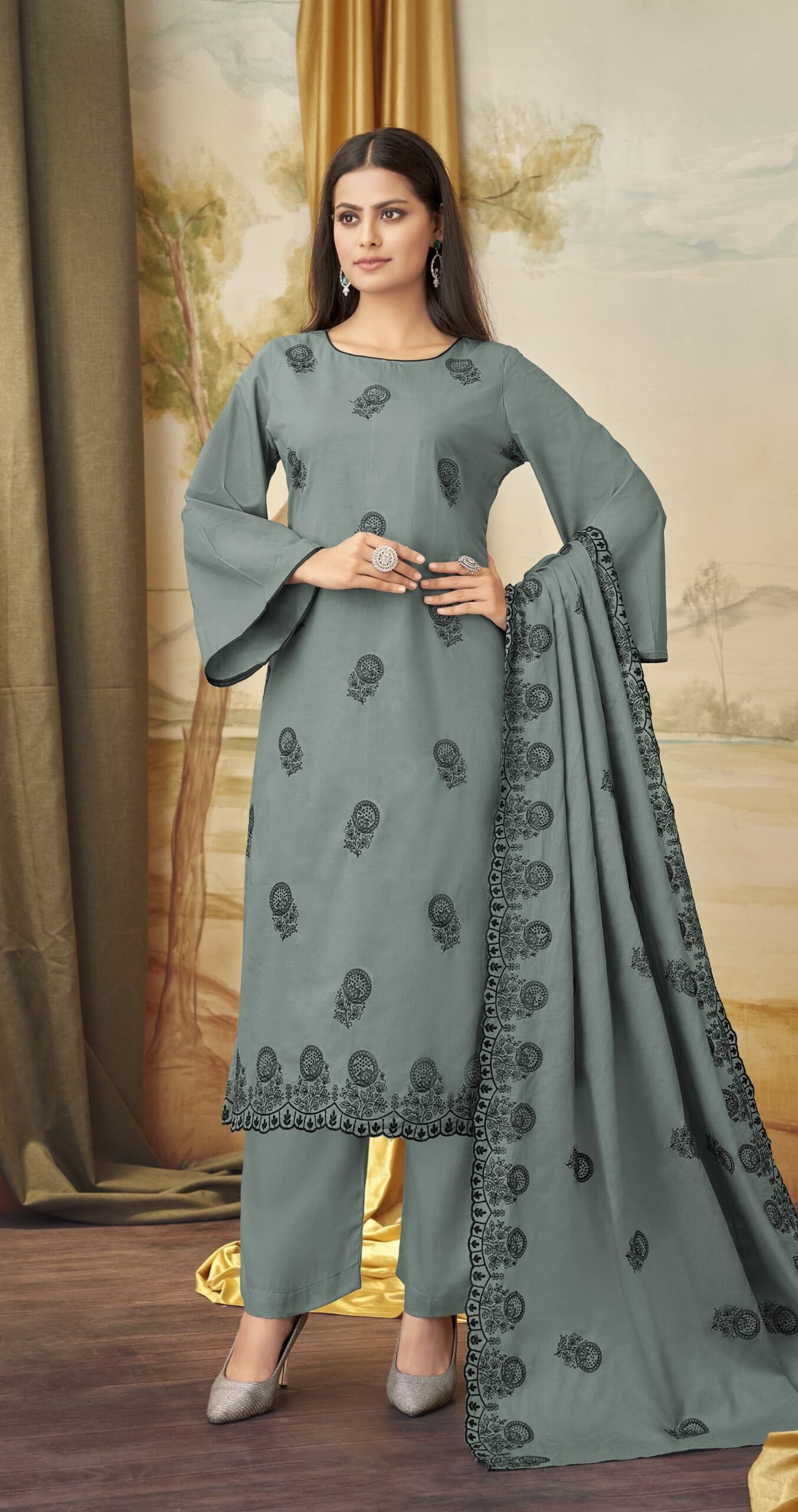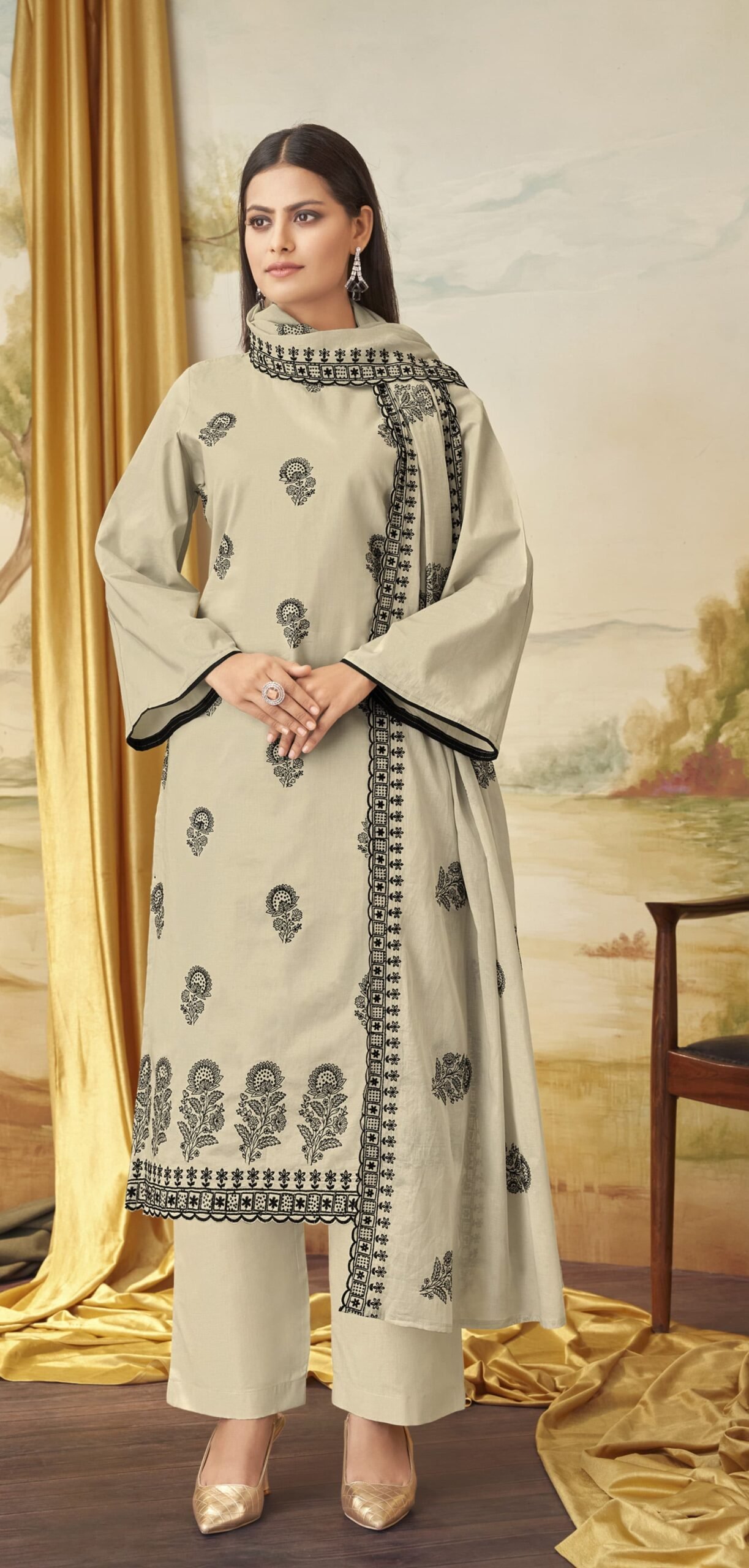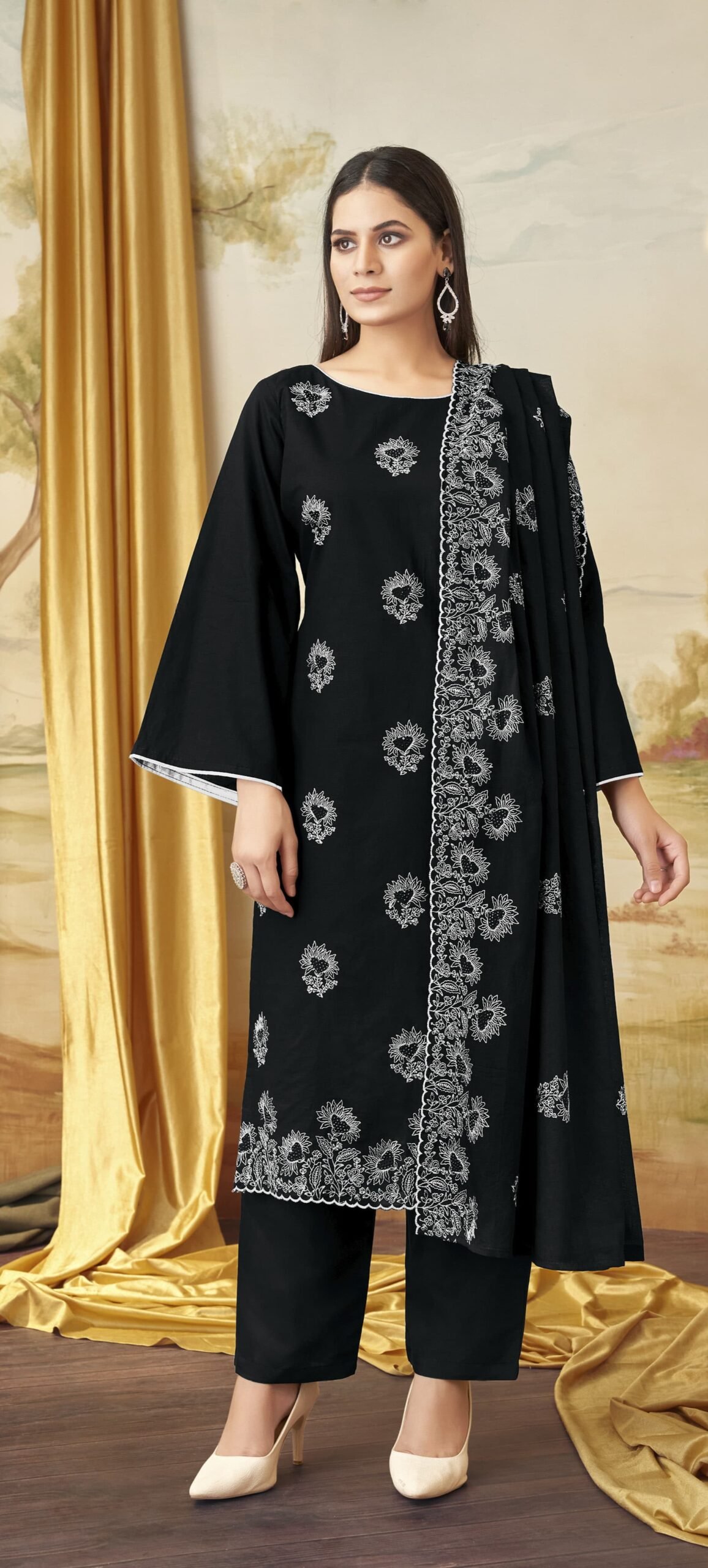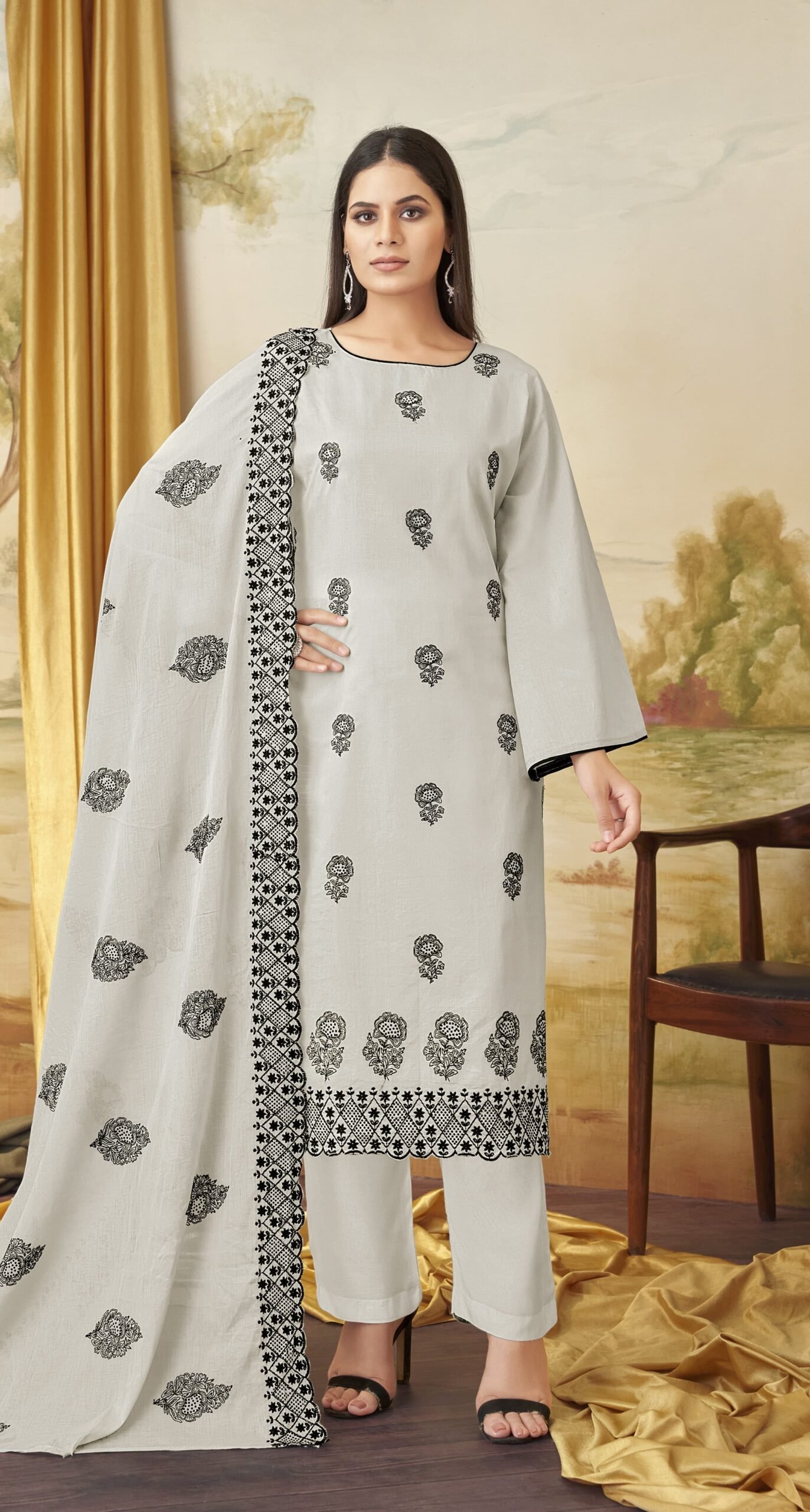 **Sophisticated Sparkle – Cotton Unstitched Suit with Black Swarovski Work!** ✨🖤